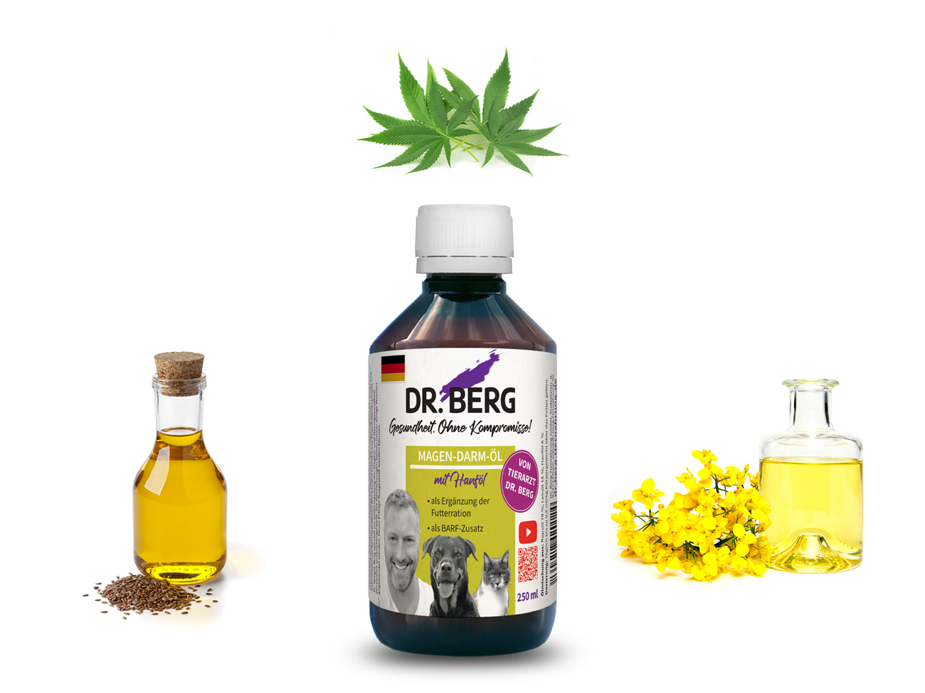 Our gastrointestinal oil blend with hemp oil optimally complements the feeding of your dog or cat with its special content of anti-inflammatory gamma-linolenic acid and its optimal ratio of essential polyunsaturated fatty acids.